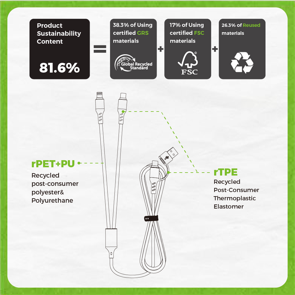 This 4-in-1 ultra-fast charging cable delivers up to 100W PD charging, supports dual iPhone charging, and syncs data seamlessly — all in one durable, eco-conscious design made from GRS-certified recycled materials.